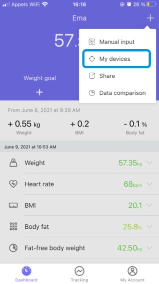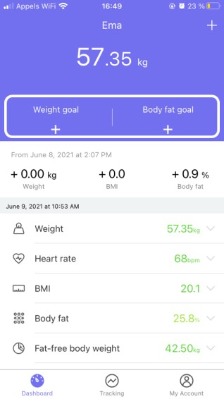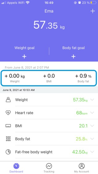 On this main screen you can see the changes in your weight, BMI and body fat in relation to a set date.