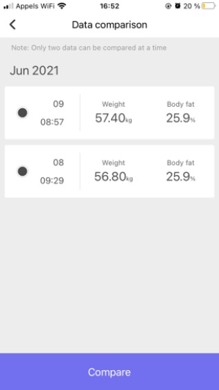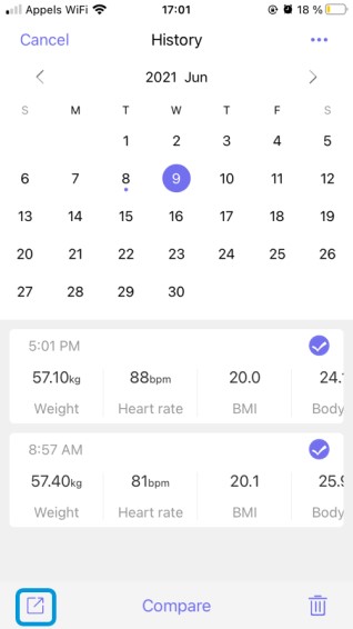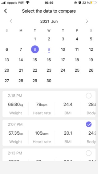 A calendar is displayed and the days on which measurements have been recorded are marked with a small purple dot. Select the day you want to compare and click on the corresponding data at the bottom of the screen.