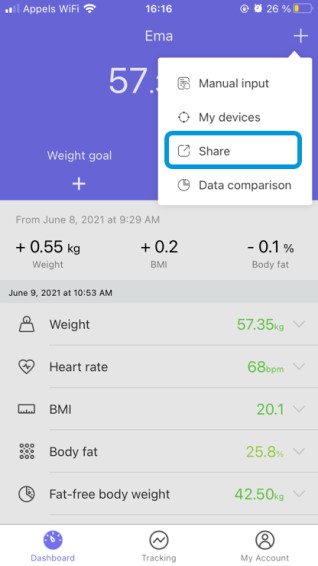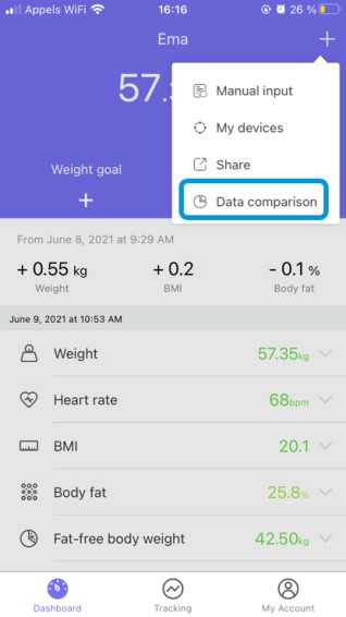 1) Directly from your Dashboard to compare your weight, BMI and body fat.