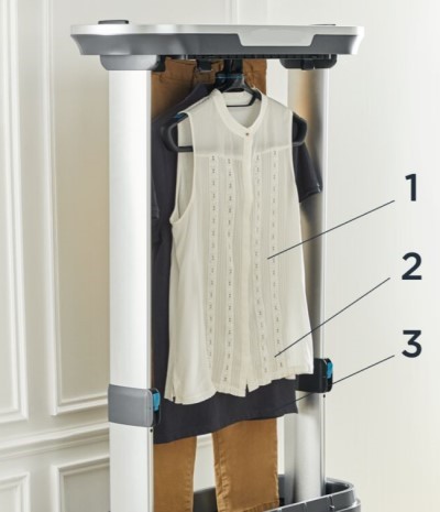 To put the garments into the Care For You appliance, use the built-in clips. Press firmly on the top of the clips to open them and insert the garment you want.