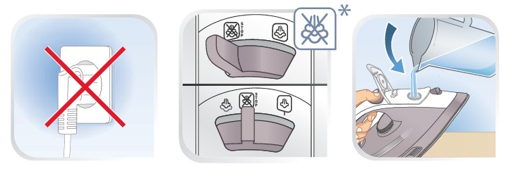 • Fill the water tank, then plug the iron back in.